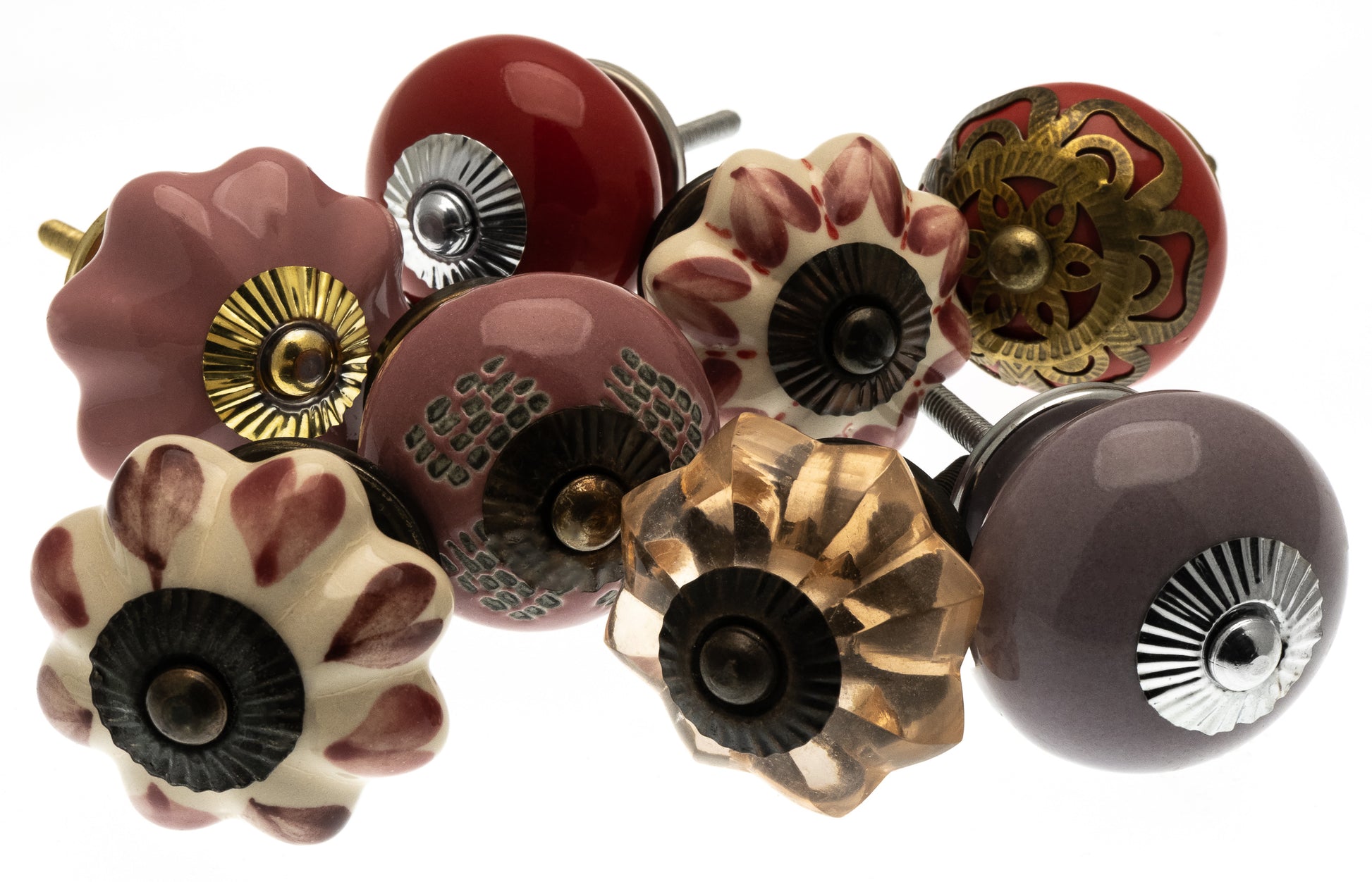 - Set of 10 Ceramic and Glass Door Knobs in Pinks & Reds
