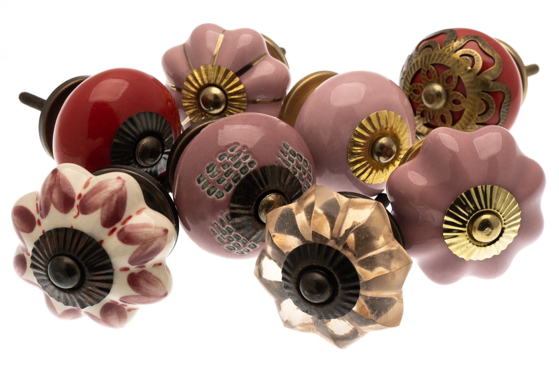 - Set of 8 Ceramic and Glass Door Knobs in Pinks & Reds
