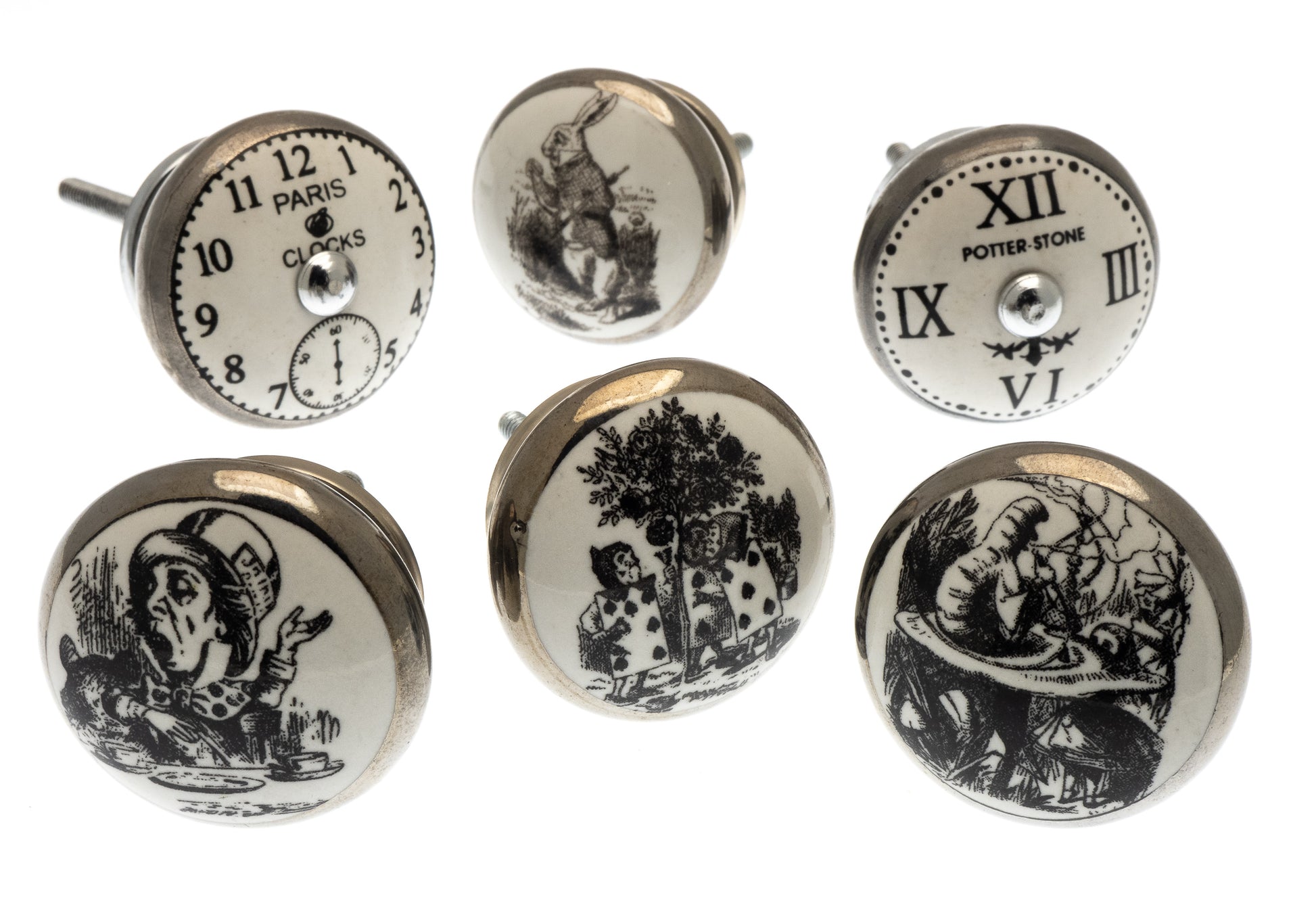 Ceramic Door Knobs Alice in Wonderland Antqe Silver Set of 6